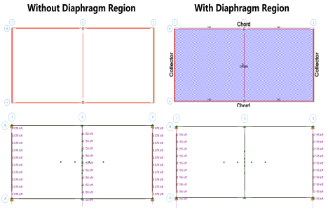 If Diaphragm Regions have not been drawn then loads are attributed to all horizontal members within the floor plane (except members perpendicular to load direction). Therefore, drag struts and collectors MUST be modeled in order to get proper load attribution into lateral frames.