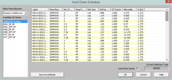 The program comes pre-loaded with three XML files, one for Simpson hold-downs, one for Canadian Simpson hold-downs, and one for USP hold-downs. The name of the XML file itself will be used in the list of databases in the Hold Down Schedule Dialog.