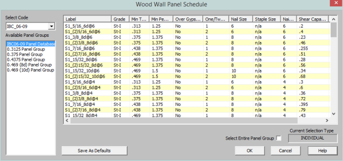 The panel labels specified on these sheets refer only to panel / nailing schedules that have already been defined on the full database sheet. The information in this sheet need not be organized in a specific order. Instead, they will always be optimized based on the assumption that the installed cost is directly related to the shear capacity. Therefore, when a group or family is selected, then the nailing schedule within the group with the code check closest to unity, but still less than 1.0 will get selected during the optimization process.