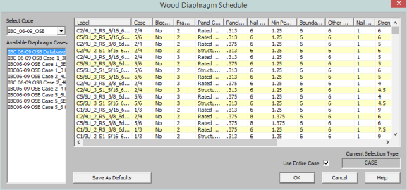 RISAFloor has design databases for wood shear walls and diaphragms which are used to optimize the nailing and hold downs for the wall. The criteria used for this optimization is specified on the Wood Wall (Fasteners) and Wood Diaphragms tabs of the Design Rules spreadsheet. In addition to this basic criteria, the user may specify a subset of the overall database from which the design / optimization must be performed.