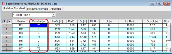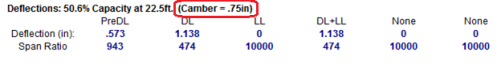 The Deflection Results spreadsheet displays a column with the camber specified for each member. Again, the deflection and span ratio results in the code checks section are calculated after the beam has been cambered.