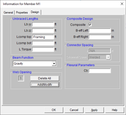 Web openings may be added to an individual beam by double clicking on the beam and navigating to the Design tab and clicking on the Add/Modify button as shown below:
