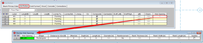 Alternatively, web openings can be added, modified, or deleted through the Beams spreadsheet as shown below: