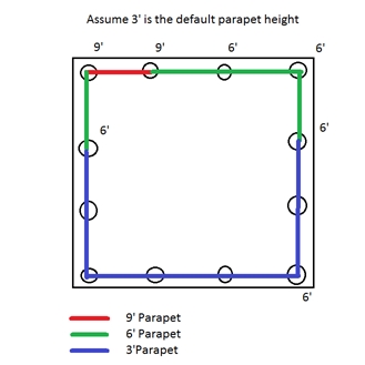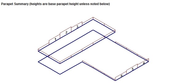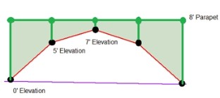 For walls a parapet is defined along a line that defines the top of the wall. Thus, the area of the parapet is trivial. For parapets defined by columns, however, we now have parapet heights at finite locations. In this case the program will go "column to column" around the structure to determine the parapet height. The parapet height used between columns is the SMALLER of the two values at each column. Below is an example of what this would look like.
