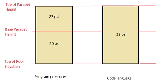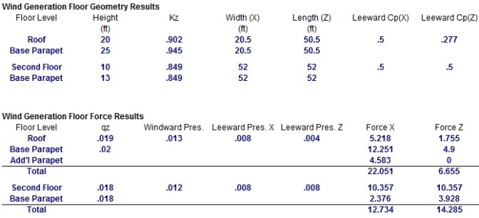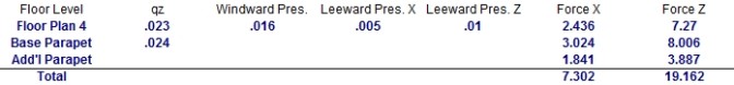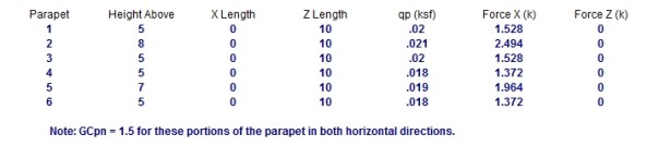 If a parapet exists at this level, then information regarding the parapet (and possibly the additional height of multiple height parapets) will be given as well and the total force due to both the main wind force and the parapet wind force will be summed.