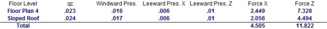 Force is calculated as the Length/Width (see above) of the diaphragm, multiplied by the tributary height of the diaphragm, multiplied by the sum of the windward and leeward pressures. The additional "Sloped Roof" wall wind force in RISAFloor integrated models is also added to this value for the Roof.