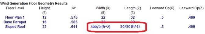 Sloped Roof Area is used to account for the wind load on walls which project above the base roof elevation due to a sloping roof. This only occurs in models which are integrated with RISAFloor. The program determines area by going from support-to-support finding vertical polygons along the slab edge, and calculating their projected area in both the X and Z directions.