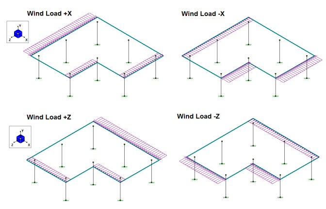 The sloped roof wind loads are applied as two-way Member Area Loads to each roof plane, and are created within roof wind load Basic Load Cases.