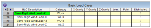 When RISA-3D is integrated with RISAFloor the program has the ability to create Semi-Rigid wind loads and apply them to the diaphragm.. The wind load is calculated by taking the Windward and Leeward forces and distributing it directly into the diaphragm as a linear load along the edge of the diaphragm. The Semi-Rigid Wind loads are placed into the Basic Load Cases shown below with distributed loads. The distributed loads are displayed per slab and the magnitude is shown but not editable. An example of the load distribution is shown on this L-shaped building.