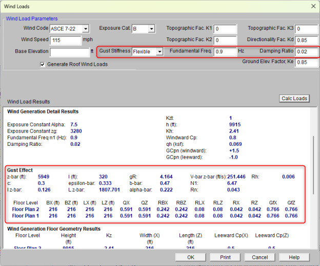 Damping Ratio is also used in the calculation of the Gust Effect Factor. This option will appear and can be modified when the Gust Stiffness is set to Flexible.