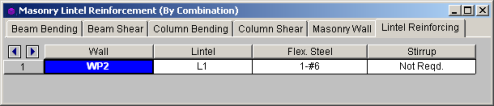 The Lintel Reinforcing tab displays analysis results for the reinforcement of each lintel defined in your masonry wall.
