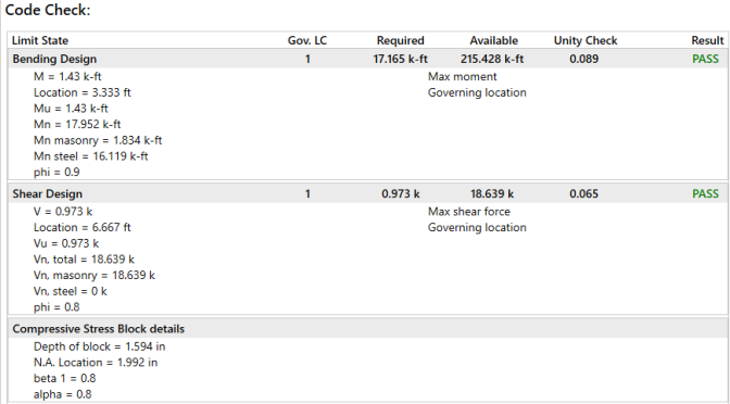 The center to center distance between reinforcing Total Width and the Eff Width (which accounts for partially grouted walls) are both reported in this section. The Flange Thick tf refers to the thickness of the face shell whereas the Effective Thick te refers to the overall effective depth of the block.