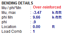 This Bending Details show the magnitude, location and load combination that correspond to the maximum moment used in the design as well as the area of flexural steel required (As) and the steel ratio (rho).