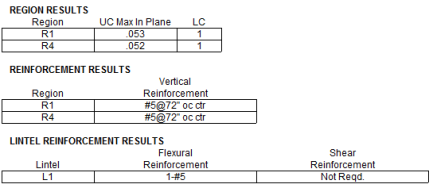 The Reinforcement Results section gives the reinforcement results for each region in the wall.
