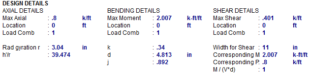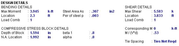 The Shear Details show the magnitude, location and load combination that correspond to the maximum shear used in the design, the M/(V*d) ratio for shear design, and the required spacing of ties (if applicable).