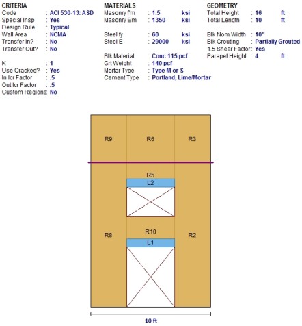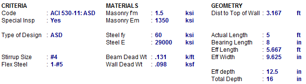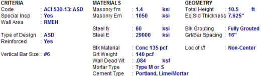 The top section of the detail report echoes back the input information used in the design of the wall region or lintel. This information is summarized below: