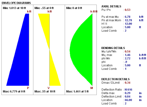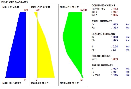 The next section of the detail report displays the envelope axial shear and moment diagrams as well as the summary of the code checks performed on the out-of-plane loaded slender wall.
