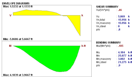 The next section of the detail report provides the envelope shear and moment diagrams as well as a summary of the code checks for the Lintel.