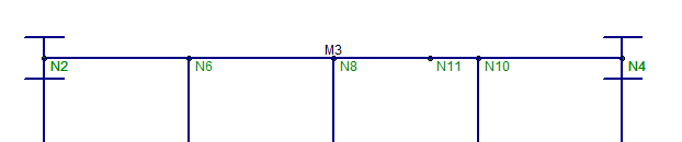 This command is only available for beam members in RISAFloor. This command works like the Segment command, except that only nodes which have another beam framing into them are considered brace points. In the example below, beam M3 is considered braced at N6, N8, and N10. N11 is ignored as a brace point since no other beam frames into M3 at N11. If the Segment command were used instead of Framing then N11 would be considered a brace point.
