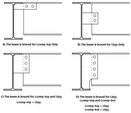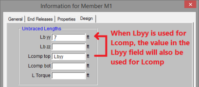 Members which experience a moment reversal along their length (such as fixed-end or continuous members) have compression in both the top and bottom flange (although not simultaneously). The program uses the appropriate Lcomp (top or bottom) based on moment direction to calculate the bending capacity at each internal section along the member.