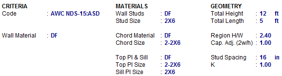 The last section of the detail report consists of the wall detailing information. This information is provided as a visual confirmation of the wall design. The wall thickness, and stud spacing are shown as dimensions. The chord sizes/forces and hold down or strap designations/forces are shown at either end.