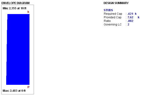 The provided capacities of these members are calculated using the standard provisions for tension/compression members. These members are assumed to be fully braced in the weak axis, and unbraced in the strong axis. For more information on the chord force calculations, see the Wood Wall - Design topic.