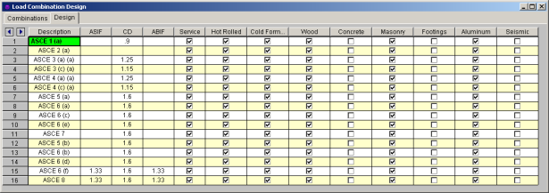 The Load Combinations Spreadsheet records the combinations of loads for solution and may be accessed by selecting Load Combinations on the Spreadsheets Menu.