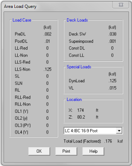 This dialog will display the loading associated with a particular Load Combination. It lets you see how the various default loading interacts with defined area loads, tapered area loads, and deck loading.