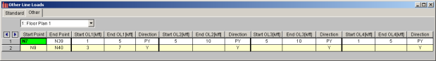 On the Other tab, the columns contain the Start and End Points and the Start and End Magnitudes of each line load for the Other Load cases as well as the load direction