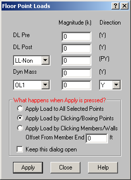 To draw point loads graphically, click the  button on the Drawing Toolbar to open the Draw Point Loads Dialog. Enter the magnitude of the point load in the categories you wish to use. Apply the point load to all selected points or by clicking or boxing grid or point locations in the model view. You may apply a point load anywhere on a floor.