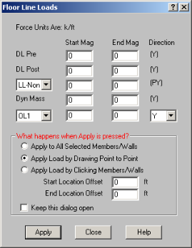 2. Click the Line Loads  button on the Drawing Toolbar and define the load in the Draw Line Loads Dialog.