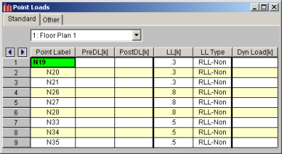 In either the Standard or Other tabs, the first column contains the point that receives the load. The next columns contain the magnitudes of the load respectively for each load case. The pull down list at the top of the spreadsheet allows you to toggle between floors.
