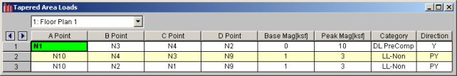 The Area Load Definitions Spreadsheet defines the uniform area load magnitudes and may be accessed by selecting Loads  Area Load Definitions from the Spreadsheets Menu. While the load magnitudes are defined in this spreadsheet, they can only be assigned graphically.