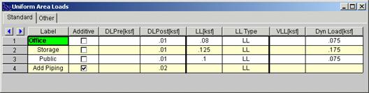 A check in the second column indicates that the load is additive. An additive load gets added to the area load defined directly beneath it. For example, loads such as piping or HVAC are sometimes applied in addition to the office or storage loads defined for that area. In the following diagram the additive piping load (Add Piping) is added directly to the office, storage, and public loads that were drawn beneath it.