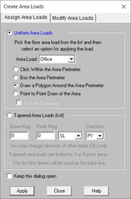 To apply area loads click  on the Drawing Toolbar to open the Draw Area Loads Dialog and select a uniform or tapered area load. For a Uniform Area Load, select the Area Load you would like to assign from the drop down list. The area loads that are listed are those that are defined in the Area Load Definitions Spreadsheet. Apply the area load by clicking within or boxing the area load perimeter, by drawing a polygon around the area load perimeter, or by clicking from point to point to define the perimeter of the area load.