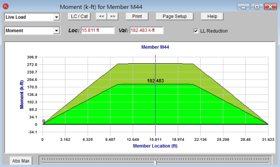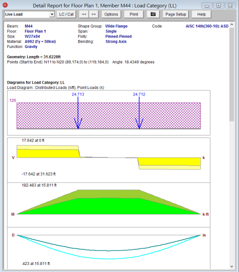 button. Once a beam detail report is open, you can also click on any of the shear, moment, deflection, or axial diagrams to open an interactive diagram. Use the cursor at the bottom to drag along the length of the member to see how the value changes.