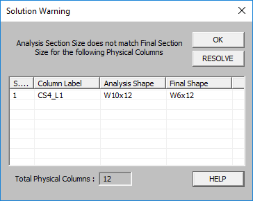 When you include the column rotational stiffness in the RISAFloor analysis (see the setting on Model Settings), changes to the column size will affect the stiffness of the floor and the distribution of forces on that floor. Because the program performs solution for upper floors first, it is common for the original "required" size of a column at an upper level to be insufficient when the forces from the lower level are added in. The column will then be resized and the "Final Shape"doesn't match the analysis size. For this reason, the program may present the user with the following dialog.