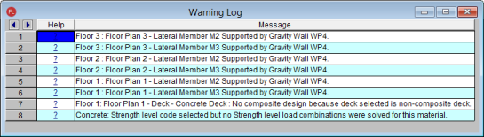 The Warning Log Spreadsheet provides you with a record of any warnings or errors that occurred during the solution of your model. The log should be reviewed for warnings or errors that would affect the design of your structure. The error log reports back the item label for which the error occurred.