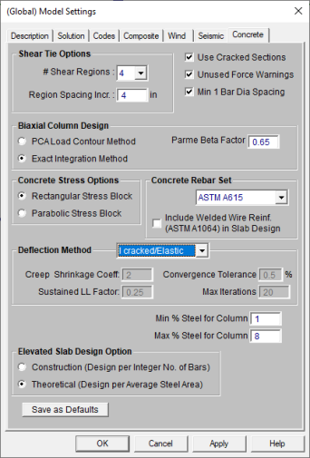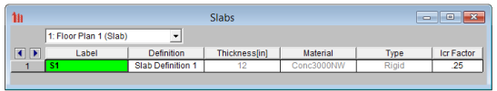 The Icr factor default is set to 0.25 per ACI 318-14 Section 6.6.3.1.1 (ACI 318-11 Section 10.10.4.1). You can modify this factor with any value between zero and 1.0 by typing in this field. The Icr factor adjusts the stiffness of the plate elements comprising the slab by altering the thickness during solution. This adjusted thickness does not, however, affect design values (reinforcement calculations).