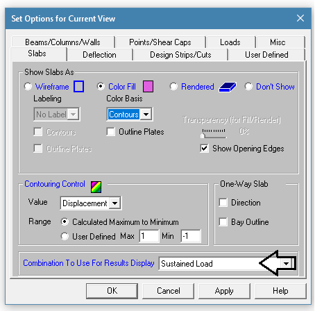 The Long Term Deflection can be viewed graphically using the Slab Contours-Displacement. The internal Load Combinations are listed in the Plot Options.