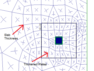 The top of the column will be submeshed and connected to the surrounding plates with rigid links in a 12" x 12" square. This approach is more accurate than modeling the column connection at only one node. When only one node is used the slab will have a higher peak moment and higher deflection at that one point. Instead the rigid links create a rigid region over the top of the column that approximate the stiffness of the column attachment to the slab. The size of the rigid links will not change based on the column dimensions as this is only approximate. In most cases there will be 4 plates inside the rigid links.