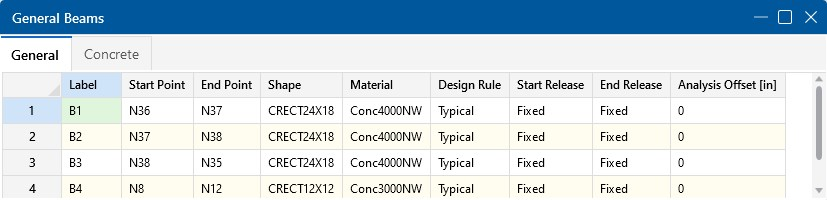 The Start and End release columns allow you to set the beam end releases to Fixed or Pinned. This determines how the beam connects to other elements at the end nodes.