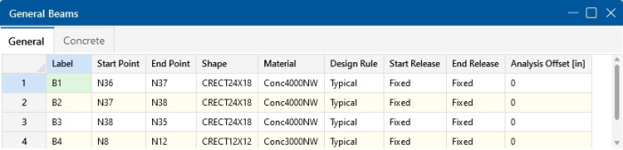 The following data columns hold the General data for the beams: