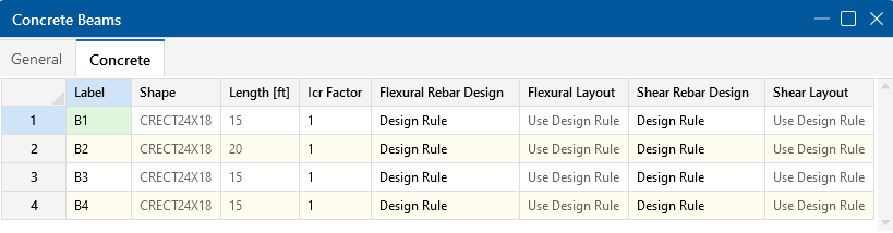 The Design Rules entry displays the selected design rule for each beam. Available design rules may be selected from the drop-down list, which contains all entries in the Design Rules Spreadsheet. For more information, see Design Optimization.