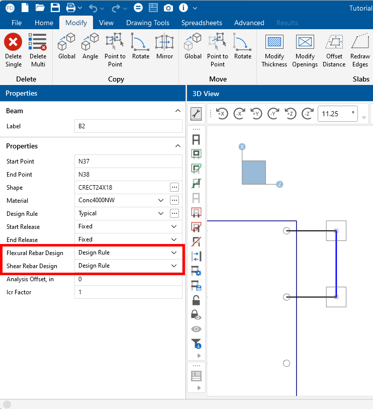 Rectangular sections are defined using a parametric shape code, since a rectangular shape may be any depth or width. The code is CRECT'depth'X'width', where 'depth' and 'width' are the values in the current dimension units. For example, if you wanted a beam that was 18" deep and 12" wide, you would enter "CRECT18X12". Note that the dimensions can also be decimal values, like "18.25".