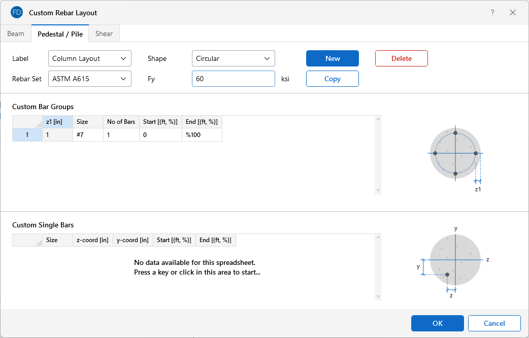 For circular pedestals, you can specify equally-spaced concentric rings of bars at given depths, z1, measured from the exterior fiber of the pedestal. You can also specify custom single bars.