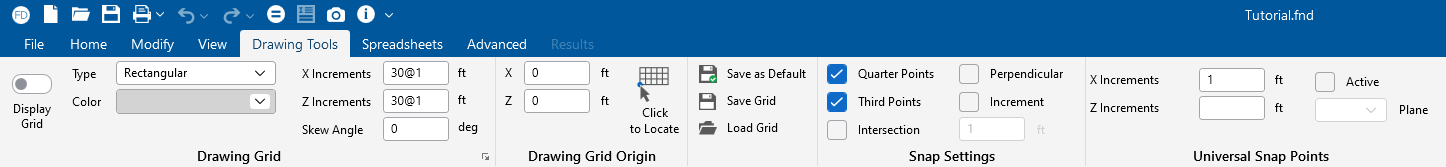 The Drawing Tools ribbon provides options to aid drawing elements in the model.