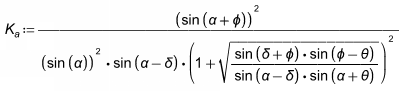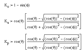 You can define the coefficient of internal friction (φ) and backfill angle (θ) in the Wall Footing Definition Editor (or the Wall Footing Definitions Spreadsheet) and allow the program to calculate K. Alternatively, you can directly input the K factors. If the program is used to calculate K, these are the equations used: