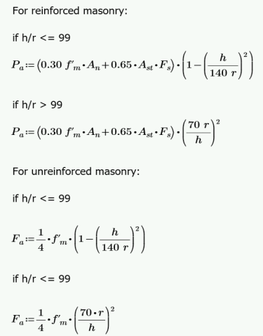 The calculation of Pa for reinforced masonry is Equation 8-16 or 8-17 and Fa for unreinforced masonry is per either Equation 8-11 or 8-12. depending on the h/r ratio. The equations are as follows: