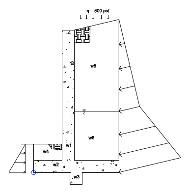 Regarding the loading of retaining walls, all hydrostatic, soil and surcharge loads are taken into account on a per foot basis. For more information, see Wall Footings - Modeling. Externally applied loads to retaining walls or strip footings are summed over the entire length of the wall and then divided out on a per foot basis. Because of this, concentrated stresses and areas of the wall that require tighter reinforcement are not taken into account. For more information on applying external loads to the model, see Wall Footings - Modeling.